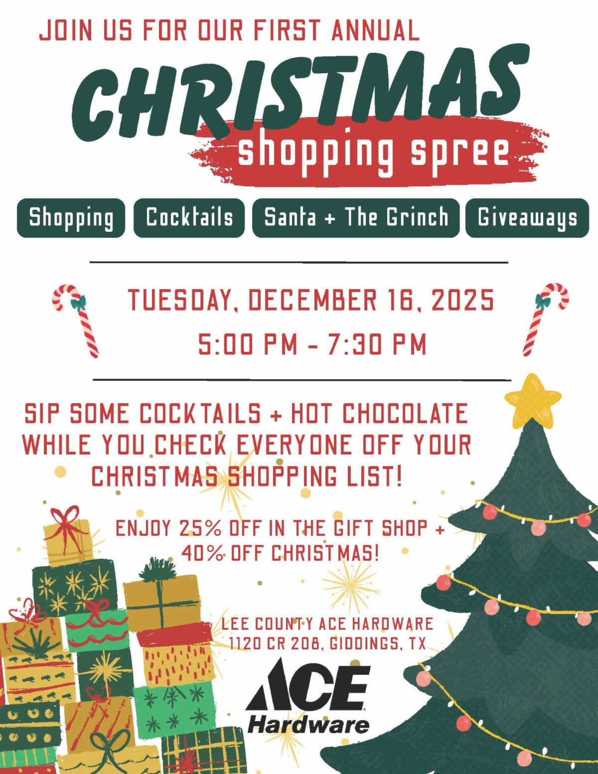 First Annual Christmas Shopping Spree at Lee County Ace Hardware. Tuesday, December 16, from 5:00 PM to 7:30 PM. It will be an evening of festive fun, holiday shopping, and community cheer.