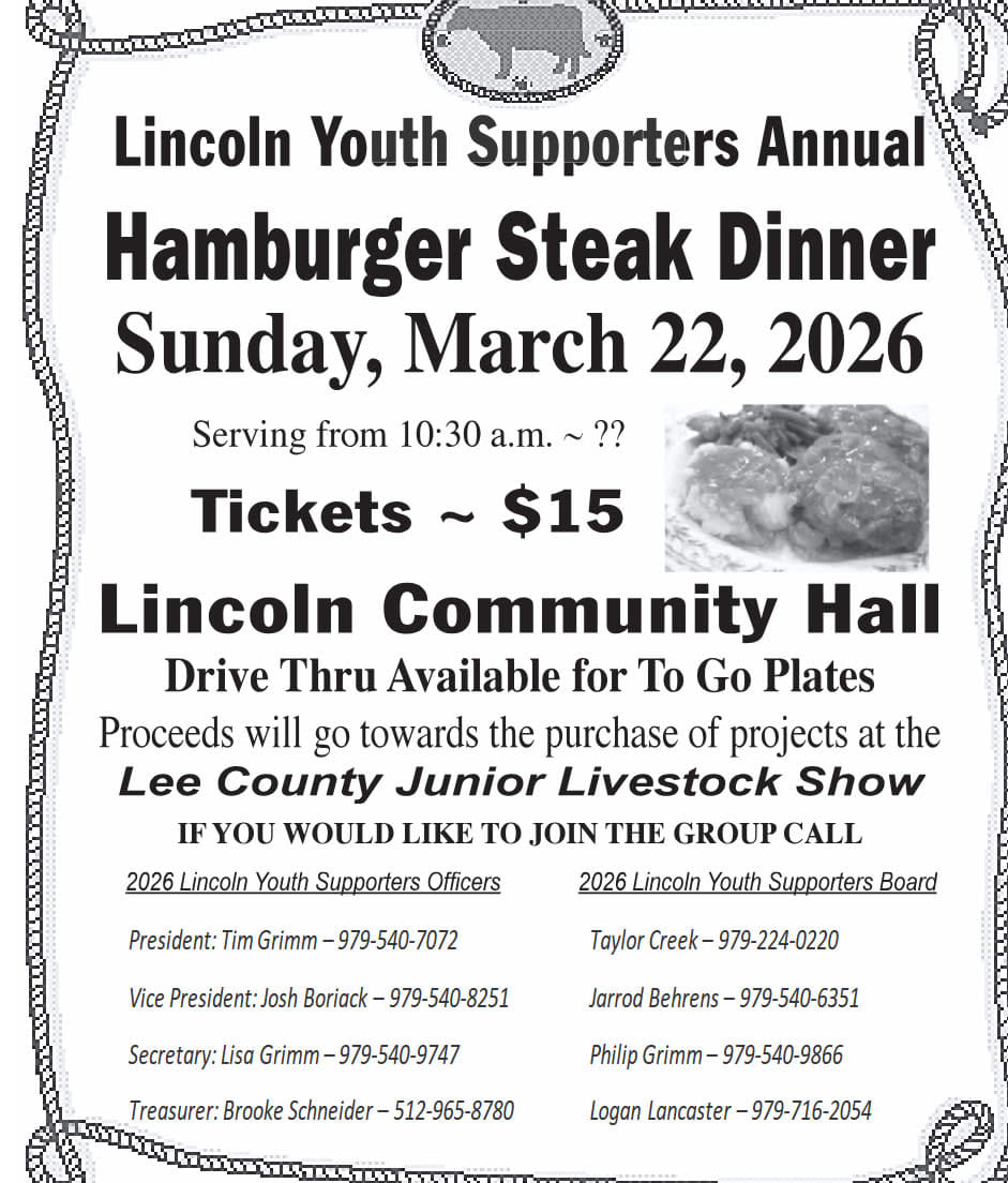 Lincoln Youth Supporters Annual Youth Supporters Annual, Hamburger Steak Dinner. March 22 from 10:30am. Tickets $15. at Lincoln Community Hall, drive thru available for to-go.Images