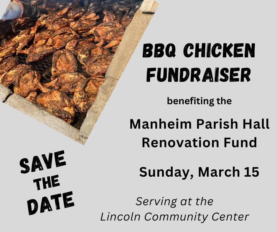 Manheim Parish Hall Renovation Fundraiser. Held at the Lincoln Community Center. Drive thru only from 10:30 AM until Sold out. BBQ Chicken (whole Chicken) $15 Pint of Noodles $4 Beans $3 Sauce $2